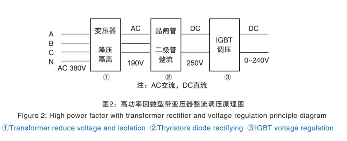 1. จำแนกตามการแก้ไขการควบคุมแรงดันไฟฟ้า: ไทริสเตอร์ (SCR) สามารถใช้ในการแก้ไขและควบคุมแรงดันไฟฟ้าพร้อมกันได้ หรือใช้ไดโอดหรือไทริสเตอร์แก้ไขก่อนแล้วใช้ IGBT ควบคุมแรงดันไฟฟ้า ใช้แรงดันไฟฟ้าควบคุม IGBT เพื่อปรับปรุงปัจจัยอุปกรณ์สามารถประหยัดไฟฟ้าและปรับปรุงคุณภาพการเชื่อมเพิ่มเติม